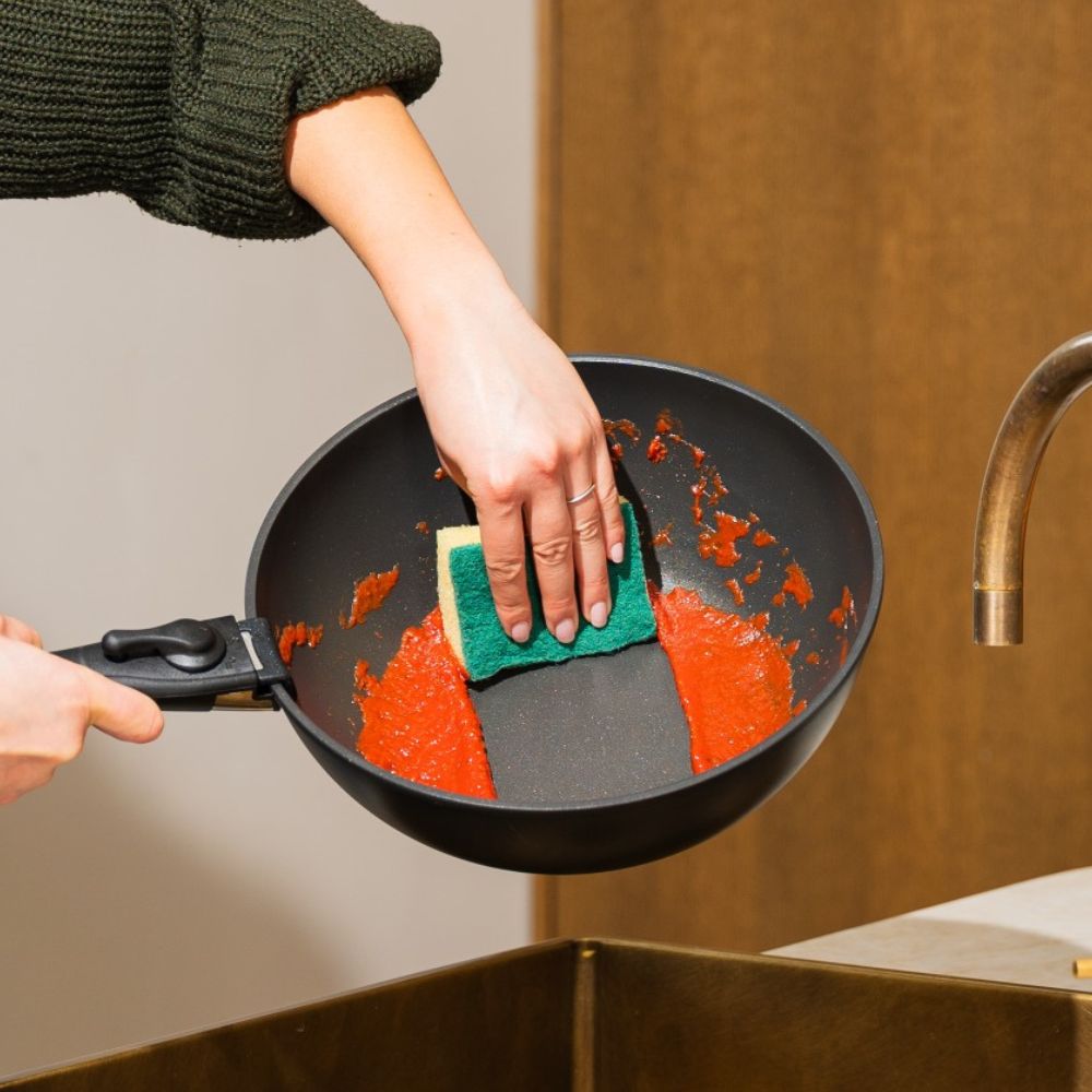 - Laat de pan afkoelen voordat je hem schoonmaakt