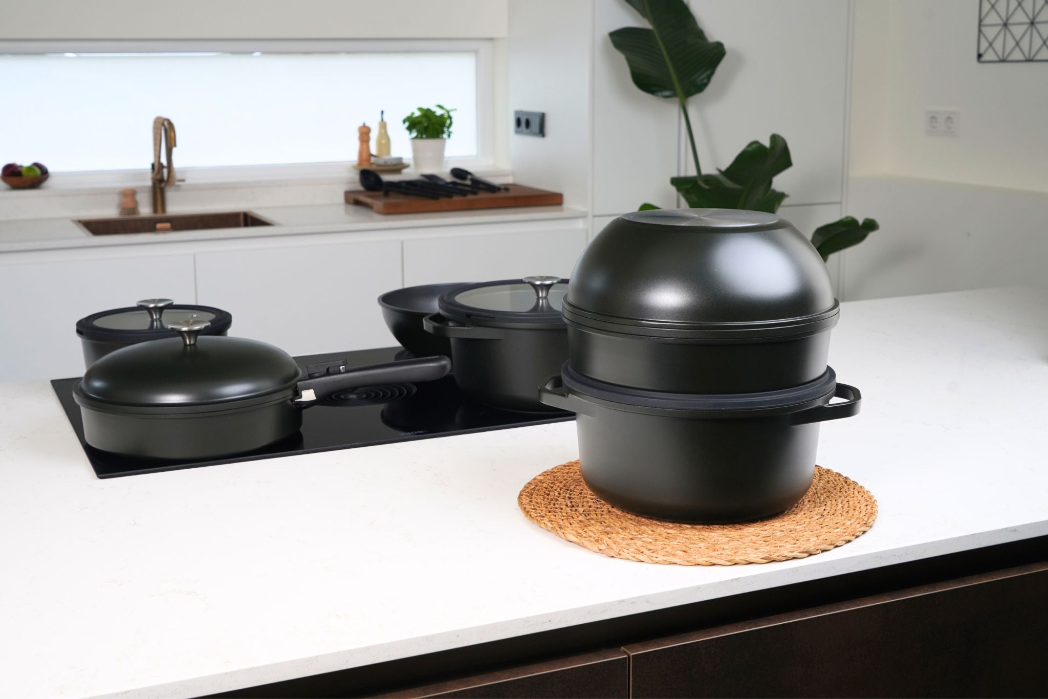 De CuliStack set is compact. Met een totale hoogte van minder dan 30 cm past hij moeiteloos in vrijwel elke pannenlade. Het stijlvolle ontwerp mag bovendien gerust gezien worden op je aanrecht.